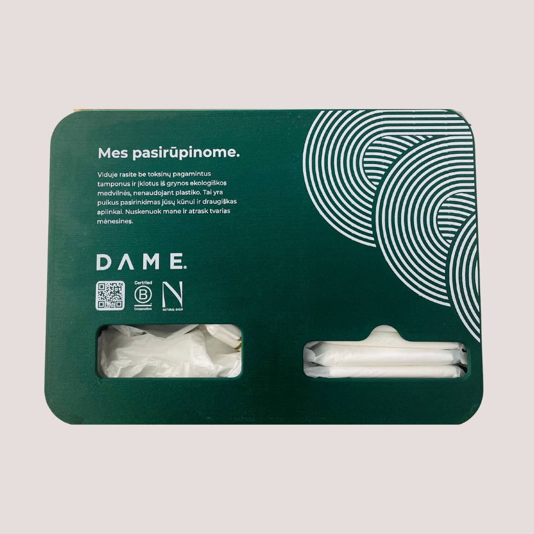 - Viduje esančios pertvaros leidžia lanksčiai organizuoti turinį. Standartinė talpa yra iki 100 vnt. DAME ekologiškų tamponų ir iki 30 vnt. įklotų.